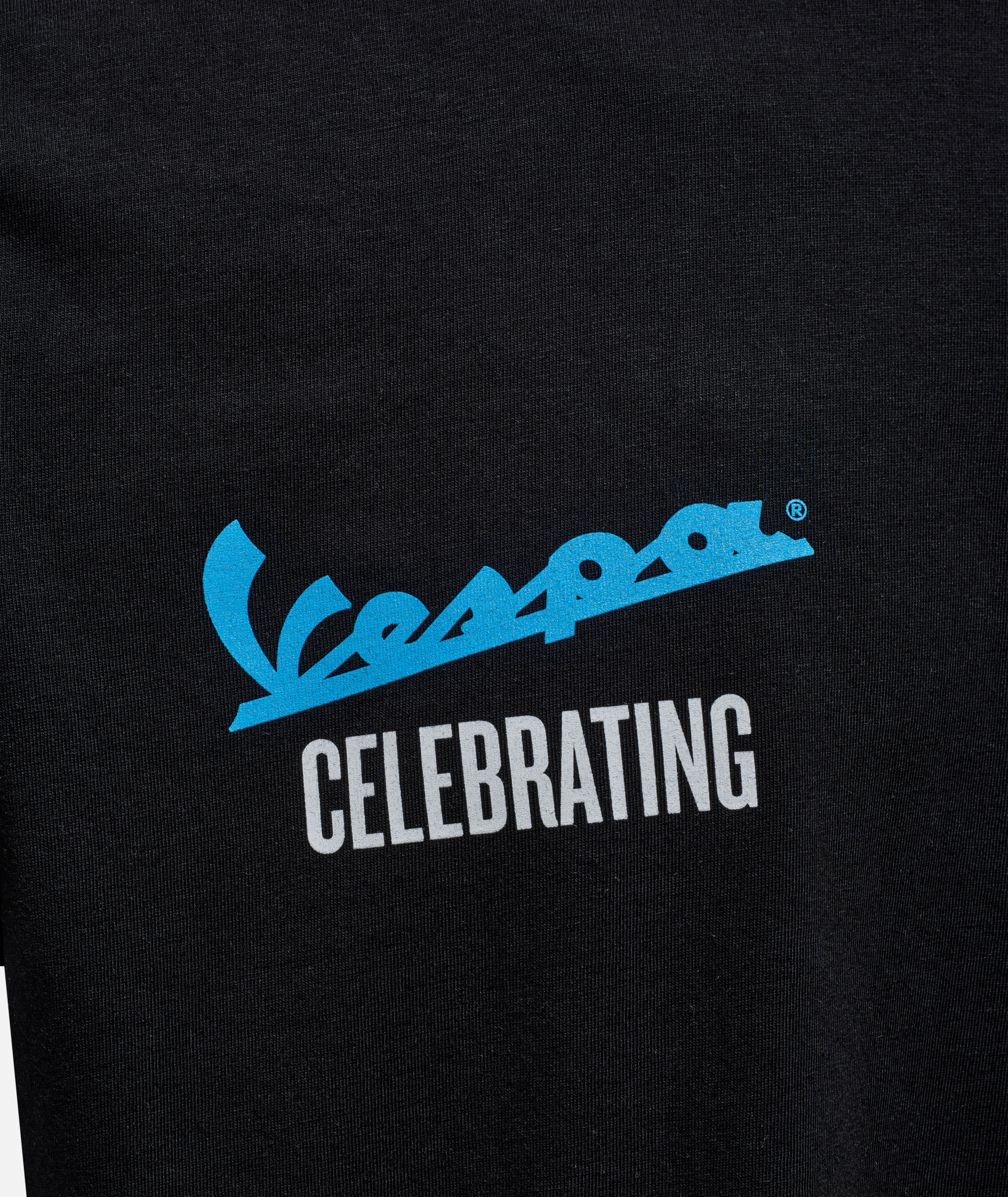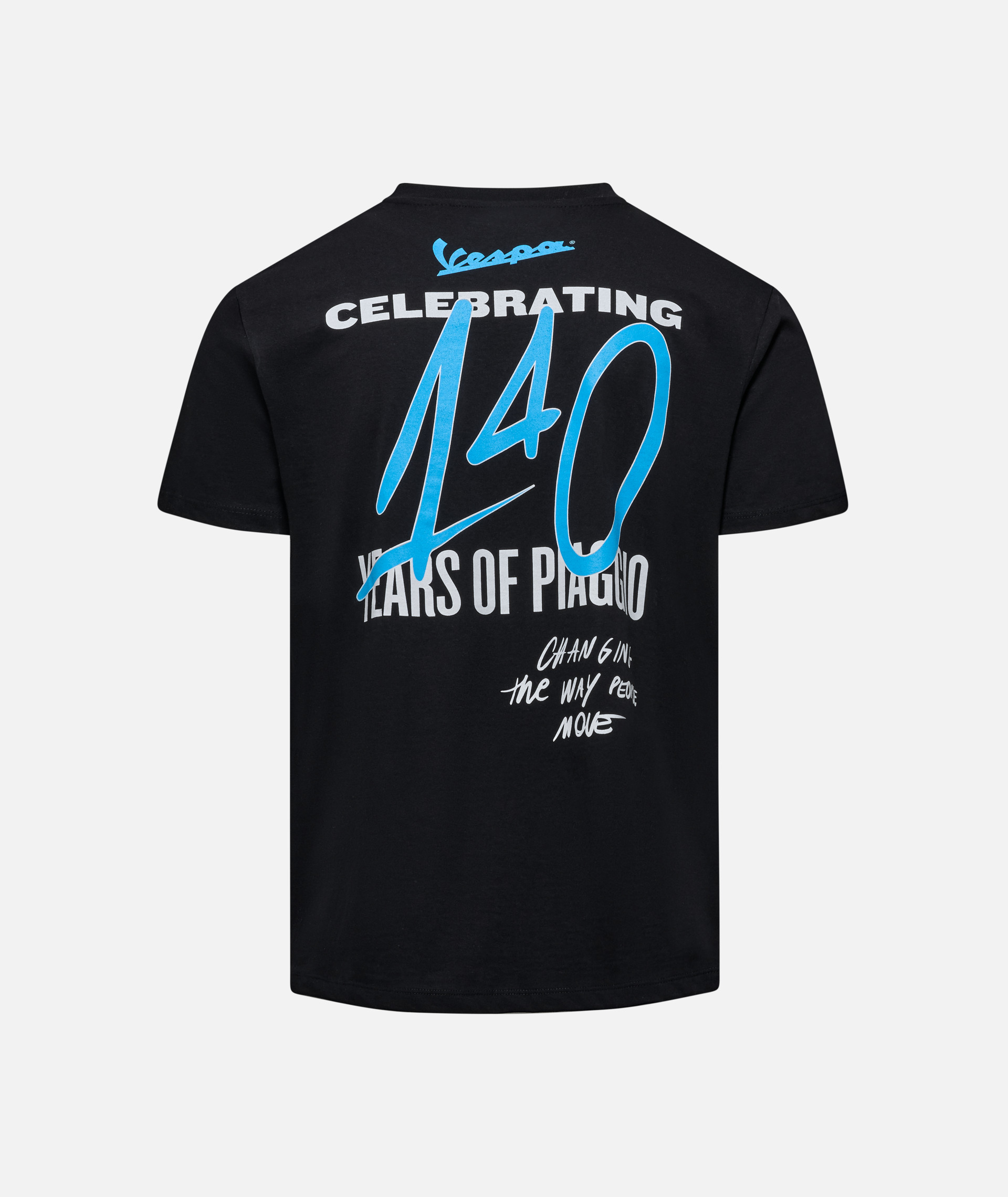 Komfortables T-Shirt aus 100% Baumwollstoff. Mit der Grafik zum 140-jährigen Jubiläum von Piaggio und dem Vespa-Logo auf der Vorder- und Rückseite.