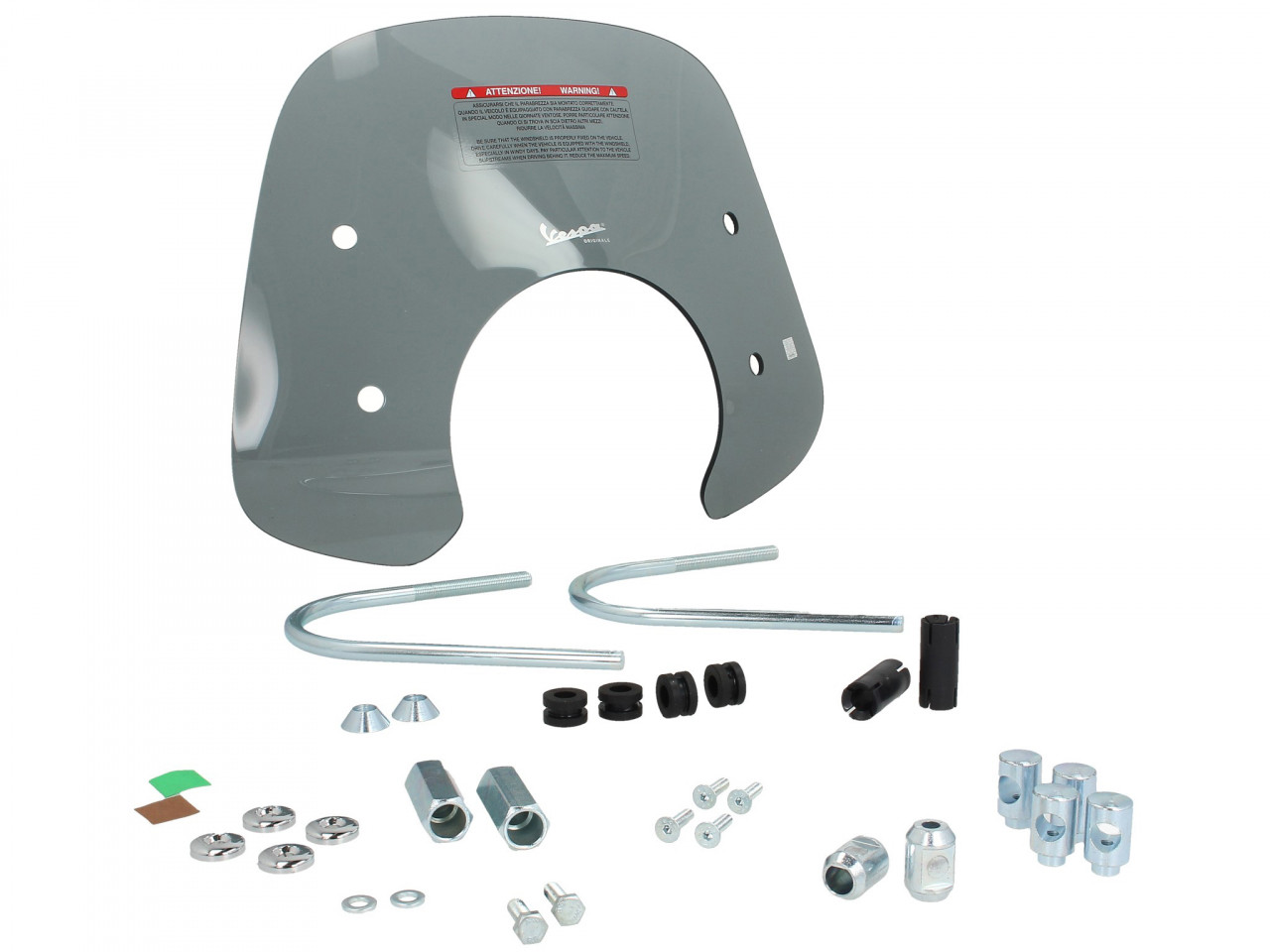 Das Vespa Logo und die verchromten Halterungen runden den effektiven Windschutz des getönten Vespa Flyscreens ab.